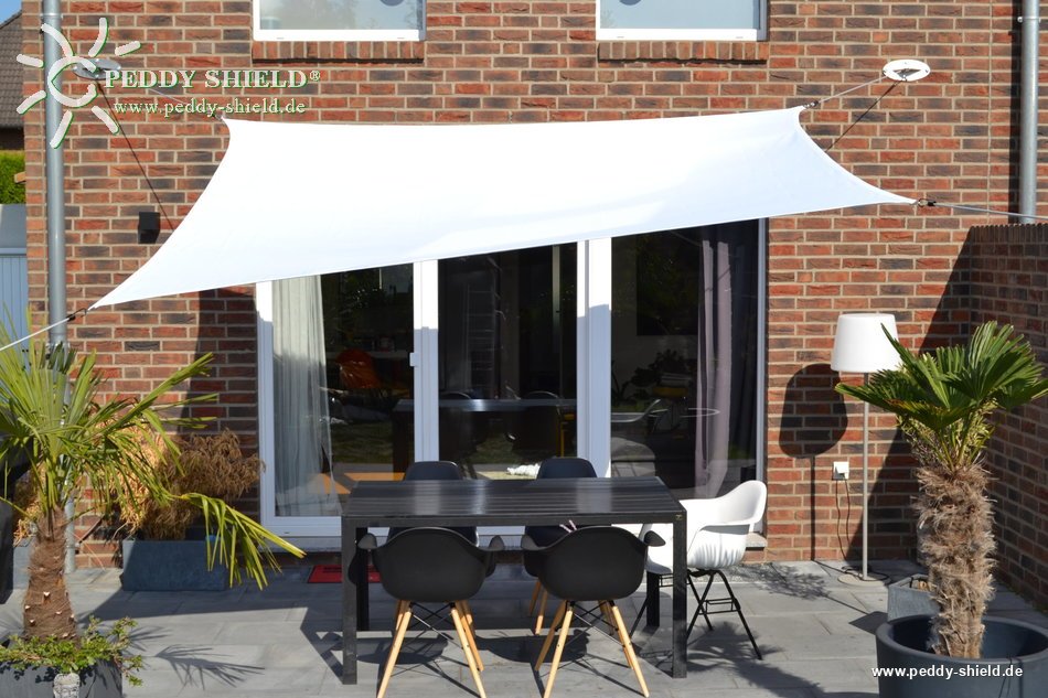Du fait que le tissu est imperméablilisé, préférez une installation inclinée pour votre voile d'ombrage au lieu d'une instalation horizontale. Cela permettra à l'eau de pluie de mieux s'écouler.